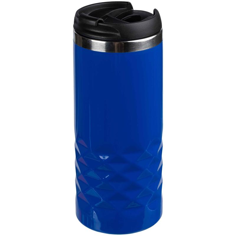 Термокружка Prism синий. Покрытие кружки напоминает глянцевую эмаль — и рельеф на поверхности корпуса дополнительно подчеркивается яркими бликами. Цилиндрическая форма позволяет сделать на кружке круговую