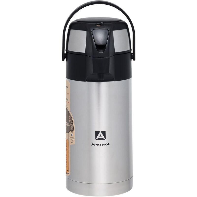 Термос Арктика 3 л серебристый. Вакуумный настольный термос объемом 3 литра пригодится в качестве источника горячей воды на весь день, освежит в жару прохладной водой или лимонадом, поможет сэкономить расход электричества и обеспечит согревающим напитком вдали от розеток. Сохраняет тепло до 28 часов. Есть удобная ручка для переноски. Рассчитан на использование на устойчивой ровной поверхности и в наполненном виде всегда должен оставаться в вертикальном положении. Лежа или при наклоне во время транспортировки термос может протечь. Материал корпуса — металл. Материал колбы — сталь. Объем: 3 литра. Размеры (ВхШхГ) — 20×15.2×38.7 см. Диаметр горлышка — 7.8 см. Время сохранения тепла до 28 ч. Время сохранения холода до 60 ч.