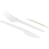 В набор входит: вилка белая 165 мм, нож белый 165 мм, зубочистка в индивидуальной упаковке, салфетка бумажная 24×24 см.