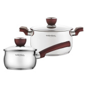 Набор кастрюль Vensal нержавеющая сталь 2 штуки (1. 1 л, 3. 3 л). Набор из кастрюли с крышкой и ковша с крышкой изготовлен из нержавеющей стали AISI304 (данный вид стали имеет высокие антикоррозийные свойства). Алюминиевая вставка обеспечивает равномерный, быстрый прогрев дна. Ручки выполнены из термостойкого пластика с силиконовым напылением (не нагреваются). Для удобства приготовления пищи внутри кастрюли сделаны отметки литража. В комплект также входят крышки из жаропрочного стекла. Кастрюлю, ковш и крышки можно мыть в посудомоечной машине. Подходит для всех видов плит, включая индукционные. Объем кастрюли 3. 3 л. Объем ковша 1. 1 л.