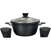 Кастрюля Panairo Veranss (VR-KAS-3-S2-K.pls) 3.3 л литой алюминий с крышкой Кастрюля предназначена для приготовления различных блюд, таких как супы, бульоны, каши и гарниры. Она подходит для семейного использования, позволяя готовить достаточно объёмные порции. Благодаря съёмным ручкам кастрюля удобна для хранения, транспортировки горячих блюд и использования в духовке. Преимущества: 1. Эта кастрюля объёмом 3,3 л подходит для приготовления первых блюд. Считается, что это самая «ходовая» кастрюля, которой вы будете пользоваться чаще всего. 2. В комплект входит стеклянная крышка, точно подходящая по размеру к кастрюле. Для правильной циркуляции воздуха на ней есть паровыпускное отверстие. Крышка снабжена ненагревающейся ручкой. 3. Съёмные ручки нового дизайна из бакелита приятно и удобно держать в руках. Благодаря свойствам бакелита в процессе приготовления пищи они не нагреваются, отличаются устойчивостью к износу и абсолютно безопасны для человека, так как не выделяют вредных веществ при нагревании кастрюли. 4. Толщина дна кастрюли составляет 5 мм, что исключает деформацию корпуса кастрюли, гарантирует её долговечность, идеально распределяет нагрев по всей поверхности, обеспечивая длительное сохранение тепла. 5. Кастрюля изготовлена из литого алюминия, что говорит о долговечности кастрюли, гарантируя прочность и качество. 6. Безопасное пятислойное усиленное антипригарное покрытие, не содержащее PFOA и PTFE, нанесено методом напыления, которое во много раз лучше покрытий по методу «наката», сохраняет антипригарные свойства на долгие годы и не выделяет вредных веществ. Посуда, произведённая методом напыления, служит намного дольше. 7. Кастрюлю можно мыть в режиме «Эко» в посудомоечной машине. 8. Подходит для использования на газовых и электрических плитах, на стеклокерамических, газовых варочных поверхностях, в том числе на галогенных конфорках. Не подходит для индукционных плит. 9. Мраморный чёрный цвет будет отлично смотреться на фоне любого интерьера. Благодаря цвету кастрюля даже после многократного использования будет долго выглядеть как новая. Перед первым использованием удалить все этикетки и упаковочные материалы, тщательно вымыть посуду тёплой мыльной водой и ополоснуть, смазать всю внутреннюю поверхность тонким слоем растительного масла. Не нагревать пустую посуду, не подвергать горячую посуду резкому охлаждению, недопустимо скольжение посуды по рабочей поверхности плиты и стола. Во избежание царапин ставьте посуду только на чистую плиту. Во время приготовления избегайте попадания соли или сахара на поверхность плиты. Рекомендуется использовать практичные кухонные приборы из силикона и дерева, которые способствуют продлению срока службы посуды.