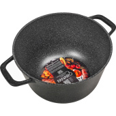 Казан литой алюминий Panairo Grantega induction Gra-KAZ-5-I 5 л чёрный Казан предназначен для приготовления различных блюд, таких как праздничный плов, душистый лагман, жаркое с картофелем или ароматная шурпа. Совместим со всеми типами плит, включая индукционные. Казан оснащён удобными литыми алюминиевыми ручками чёрного мраморного цвета, которые отличаются высокой прочностью и обеспечивают комфортное использование. Основные особенности и характеристики: 1. Этот пятилитровый казан отлично подходит для приготовления больших порций блюд, особенно в большой семье. 2. Удобные литые алюминиевые ручки никогда не сломаются благодаря материалу изготовления. Посуда обладает высокой стойкостью к деформациям и внешним повреждениям. 3. Казан можно использовать в духовом шкафу: достаточно снять крышку (в комплект не входит), чтобы превратить его в удобную посуду для запекания. 4. Толщина дна казана составляет 5 мм, а стенок 3 мм, что исключает деформацию корпуса, гарантирует долговечность и обеспечивает равномерное распределение тепла по всей поверхности, благодаря чему еда не пригорает и равномерно доходит до готовности. 5. Казан изготовлен из литого алюминия, который является наиболее качественным методом производства посуды. Такая технология обеспечивает прочность, долговечность и высокие эксплуатационные характеристики изделия. 6. Безопасное пятислойное усиленное антипригарное покрытие, нанесённое методом напыления, сохраняет свои свойства на долгие годы и не содержит PFOA и PTFE. Благодаря этому покрытие служит дольше, чем аналоги, созданные методом «наката», и не выделяет вредных веществ. 7. Диаметр по верхнему краю составляет 24 см, высота — 140 мм, а объём — 5 л. 8. Совместимость с различными типами плит, включая газовые, электрические, стеклокерамические, индукционные и галогенные конфорки, делает казан универсальным выбором для любой кухни. 9. Мраморный чёрный цвет казана отлично впишется в любой интерьер и будет долго выглядеть как новый даже после многократного использования. 10. Подходит для мытья в посудомоечной машине в режиме «Эко». 11. Тип упаковки: картонная коробка. Правила ухода за посудой Panairo: 1. Перед первым использованием удалить все этикетки и упаковочные материалы, тщательно вымыть посуду тёплой мыльной водой и ополоснуть. После этого смазать всю внутреннюю поверхность тонким слоем растительного масла. 2. Не нагревать пустую посуду и не подвергать горячую посуду резкому охлаждению. 3. Избегать скольжения посуды по рабочей поверхности плиты и стола. Ставить казан только на чистую плиту. 4. Во время приготовления избегать попадания соли или сахара на поверхность плиты. 5. Рекомендуется использовать практичные кухонные приборы из силикона и дерева для продления срока службы посуды. 6. Для очистки не рекомендуется использовать губки с абразивным слоем, так как это может повредить поверхность изделия.