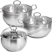Посуда для индукционной плиты имеет многослойное капсульное дно, которое быстро и равномерно накапливает тепло и также равномерно передает его пище. Такое дно позволяет готовить блюда с минимальным количеством воды и жира, сохраняя при этом вкусовые и питательные свойства продуктов. Крышки изготовлены из жаростойкого стекла, оснащены ручками, отверстиями для выпуска пара и металлическим ободом.