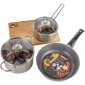 Цветовая палитра корпуса включает в себя серебристый и черный цвет, что придает набору современный и стильный вид. На сковороде есть антипригарное покрытие. Посуда изготовлена из нержавеющей стали.