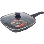 Сковорода-гриль Panairo Harfe Black 27×27 см с антипригарным покрытием/с крышкой/со съёмной ручкой Предназначена для приготовления разнообразных блюд, таких как рагу, жаркое, овощи и морепродукты. Преимущества: 1. В комплект входит стеклянная крышка, точно подходящая по размеру. На ней есть паровыпускное отверстие для правильной циркуляции воздуха. Ручка крышки изготовлена из силикона и приятна на ощупь. 2. Съёмная ручка из бакелита удобна и комфортна в использовании. Она не нагревается во время готовки, устойчива к износу и безопасна для человека, так как не выделяет вредных веществ. 3. При желании готовить в духовом шкафу можно легко снять ручку, превратив сковороду в удобную посуду для запекания. 4. Благодаря большому размеру (27×27 см по верхним краям) стейки можно расположить так, чтобы они не соприкасались друг с другом, и легко переворачивать их в процессе приготовления. 5. Рифлёное дно с высокими рёбрами и желобками для слива на краях стенок отличает сковороду-гриль от обычных сковород. Дно и стенки создают сильный жар при разогреве, благодаря чему стейк максимально прожаривается, но не подгорает. 6. Стенки сковороды-гриля равномерно распределяют тепло, позволяют использовать разные температурные режимы с наибольшим эффектом. В специальные желобки вытекает лишний жир и соки, в которых блюдо пропитывается, становясь вкусным и полезным без излишков жира. 7. Толщина дна составляет 5 мм, что исключает деформацию корпуса, гарантирует долговечность, равномерно распределяет нагрев и обеспечивает длительное сохранение тепла, благодаря чему еда не пригорает и равномерно прожаривается. 8. Сковорода-гриль изготовлена из литого алюминия, который считается лучшим методом производства посуды. Такой способ гарантирует прочность, качество и длительный срок службы. 9. Безопасное антипригарное покрытие (не содержит PFOA и PTFE) нанесено методом напыления, что делает его более долговечным, чем покрытия, нанесённые методом «наката». Оно сохраняет свои свойства на долгие годы и не выделяет вредных веществ. 10. Сковороду-гриль можно мыть в режиме «Эко» в посудомоечной машине. 11. Подходит для газовых, электрических, стеклокерамических плит, включая галогенные конфорки. Не подходит для индукционных плит. 12. Мраморный чёрный цвет универсален для любого интерьера и позволяет посуде долго сохранять новый вид даже после многократного использования. Перед первым использованием удалить этикетки и упаковочные материалы, вымыть посуду тёплой мыльной водой и ополоснуть. Смазать внутреннюю поверхность тонким слоем растительного масла. Не нагревать пустую посуду, избегать резкого охлаждения горячей посуды. Недопустимо скольжение посуды по рабочей поверхности плиты или стола. Во избежание царапин ставить посуду только на чистую плиту. Избегать попадания соли или сахара на поверхность во время приготовления. Рекомендуется использовать кухонные приборы из силикона и дерева для продления срока службы посуды.