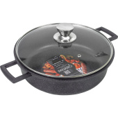 Жаровня Panairo Lordom диаметр 28 см 4 л литой алюминий (LO-SOT-28-AL-K.Chr) Жаровня предназначена для приготовления разнообразных блюд, таких как запеканки, тушёные овощи, мясо и птица. Она идеально подходит для использования как на плите, так и в духовке, что делает её универсальным помощником на кухне. Благодаря высоким бортам и удобной конструкции жаровня позволяет готовить блюда с минимальным количеством масла, сохраняя их натуральный вкус и полезные свойства. Преимущества: 1. Благодаря большому диаметру (28 см) и объёму (4 л), которых достаточно для большой семьи и гостей, в ней удобно перемешивать. Жаровня безупречно подходит для тушения и томления. 2. В комплект входит стеклянная крышка, точно подходящая по размеру. Для правильной циркуляции воздуха на ней есть паровыпускное отверстие. На крышке устойчивая к износу ручка из нержавеющей стали. 3. Удобные литые алюминиевые ручки, расположенные по бокам жаровни, благодаря материалу изготовления никогда не сломаются. Посуда отличается высокой стойкостью к деформациям и внешним повреждениям. 4. Для готовки в духовом шкафу достаточно снять крышку, и жаровня превратится в удобную посуду для запекания. 5. Стенки жаровни высокие (8 см) и толстые: они лучше распределяют тепло, позволяют использовать разные температурные режимы с максимальной эффективностью и предотвращают попадание частичек еды за пределы жаровни, что поможет сохранить чистоту кухни. 6. Толщина дна составляет 5 мм, что исключает деформацию корпуса, гарантирует долговечность, идеально распределяет нагрев и обеспечивает длительное сохранение тепла, благодаря чему еда не пригорает и равномерно готовится. 7. Жаровня изготовлена из литого алюминия. Литой метод производства считается лучшим на рынке посуды. Это гарантирует прочность, качество и длительный срок службы. 8. Безопасное пятислойное усиленное антипригарное покрытие, нанесённое методом напыления, значительно превосходит покрытия, нанесённые методом «наката». Оно сохраняет антипригарные свойства на долгие годы и не выделяет вредных веществ. Посуда, произведённая методом напыления, служит намного дольше. 9. Жаровню можно мыть в режиме «Эко» в посудомоечной машине. 10. Подходит для использования на газовых, электрических, стеклокерамических плитах, включая галогенные конфорки. Не подходит для индукционных плит. 11. Гранитный чёрный цвет отлично впишется в любой интерьер. Благодаря цвету посуда даже после многократного использования будет долго выглядеть как новая. Перед первым использованием удалить все этикетки и упаковочные материалы, тщательно вымыть посуду тёплой мыльной водой и ополоснуть. Смазать всю внутреннюю поверхность тонким слоем растительного масла. Не нагревать пустую посуду, не подвергать горячую посуду резкому охлаждению. Недопустимо скольжение посуды по рабочей поверхности плиты и стола. Во избежание царапин ставьте посуду только на чистую плиту. Во время приготовления избегайте попадания соли или сахара на поверхность плиты. Рекомендуется использовать практичные кухонные приборы из силикона и дерева для продления срока службы посуды.