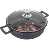Жаровня Panairo Raitens induction диаметр 28 см 4 л литой алюминий (Rai-SOT-28-AL-K.Chr-I) Предназначена для приготовления различных блюд, таких как жарка, тушение или обжаривание на высоких температурах. Она подходит для всех типов плит, включая индукционные. Основные особенности и преимущества: 1. Благодаря большому диаметру (28 см) и объёму (4 л), в ней удобно перемешивать. Безупречно подходит для тушения и томления. 2. В комплект входит стеклянная крышка, точно подходящая по размеру. Для правильной циркуляции воздуха на ней есть паровыпускное отверстие. На крышке устойчивая к износу ручка из нержавеющей стали, которую приятно держать в руке. 3. Удобные литые алюминиевые ручки, расположенные по бокам, благодаря материалу изготовления никогда не сломаются. Посуда имеет высокую стойкость к деформациям и внешним повреждениям. 4. Если снять крышку, то жаровня превратится в удобную посуду для запекания. 5. Стенки высокие (8 см) и толстые: они лучше распределяют тепло, позволяют использовать разные температурные режимы с наибольшим эффектом, а также предотвращают попадание частичек еды за пределы жаровни. Это позволит надолго сохранить чистоту кухни. 6. Толщина дна составляет 5 мм, что исключает деформацию корпуса жаровни, гарантирует её долговечность, идеально распределяет нагрев по всей поверхности, обеспечивая длительное сохранение тепла, благодаря чему еда не пригорает и равномерно доходит до готовности. 7. Жаровня произведена из литого алюминия. Это говорит о том, что посуда прослужит долгое время, гарантируя прочность и качество. 8. Безопасное (не содержит PFOA и PTFE), пятислойное усиленное антипригарное покрытие, нанесённое методом напыления, во много раз лучше, чем покрытия по методу «наката», сохраняет антипригарные свойства на долгие годы и не выделяет вредных веществ. Посуда, произведённая методом напыления, служит намного дольше. 9. Можно мыть в режиме «Эко» в посудомоечной машине. 10. Подходит для использования на газовых и электрических плитах, на стеклокерамических, индукционных, газовых варочных поверхностях, на галогеновых конфорках. 11. Мраморный чёрный цвет будет отлично смотреться на фоне любого интерьера. Благодаря этому цвету даже после многократного использования жаровня будет долго выглядеть как новая. Перед первым использованием удалить все этикетки и упаковочные материалы, тщательно вымыть посуду тёплой мыльной водой и тщательно ополоснуть, смазать всю внутреннюю поверхность тонким слоем растительного масла. Не нагревать пустую посуду, не подвергать горячую посуду резкому охлаждению, недопустимо скольжение посуды по рабочей поверхности плиты и стола. Во избежание царапин ставьте посуду только на чистую плиту. Во время приготовления избегайте попадания соли/сахара на поверхность плиты. Рекомендуем использовать практичные кухонные приборы из силикона и дерева — они способствуют продлению срока службы посуды.