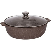Жаровня Мечта Гранит Brown диаметр 26 см 3 л алюминий (33806) Серия Гранит brown — это литая алюминиевая толстостенная посуда с антипригарным покрытием повышенной стойкости, разработанным фирмой Weilburger Coatings GmbH. Покрытие разработано на водной основе и не содержит перфтороктановую кислоту. Благодаря слою, упроченному кристаллами минералов, покрытие отличается особой износостойкостью и отличными антипригарными свойствами. Цвет — коричневый. Объём: 3 л. Размер: 26×8 см. Сделана из алюминия. Со стеклянной крышкой в комплекте. Подходит для всех типов плит, кроме индукционных. Можно мыть в посудомоечной машине и использовать в духовке.