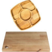В комплект также входит разделочная доска размером 30×20×1,8 см, изготовленная из массива дерева. Менажница и доска имеют однородную структуру, что предотвращает появление трещин и сохраняет ровную поверхность. Защитное покрытие маслом уменьшает проникновение запахов внутрь древесины. Рекомендуется регулярно обновлять покрытие минеральным или растительным маслом, чтобы продлить срок службы изделия.