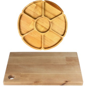 Менажница имеет 7 секций и изготовлена из дерева. Размер: 280×280×18 мм. Объем: 500 мл. Цвет: бежевый. Менажницу нельзя мыть в посудомоечной машине. В подарок идет разделочная доска (размер: 30×20×1,8 см) из массива дерева.