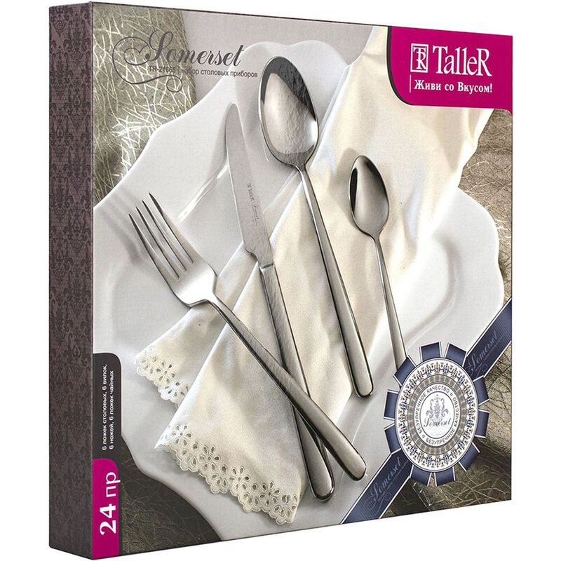 Торговая марка TalleR Страна происхождения Китай Материал нержавеющая сталь Ценовая категория стандарт Количество предметов в наборе 24 Комплектация 6 вилок, 6 ножей, 6 ложек столовых, 6 ложек чайных Вид упаковки картонная коробка Количество персон 6 Возможность мытья в посудомоечной машине да -