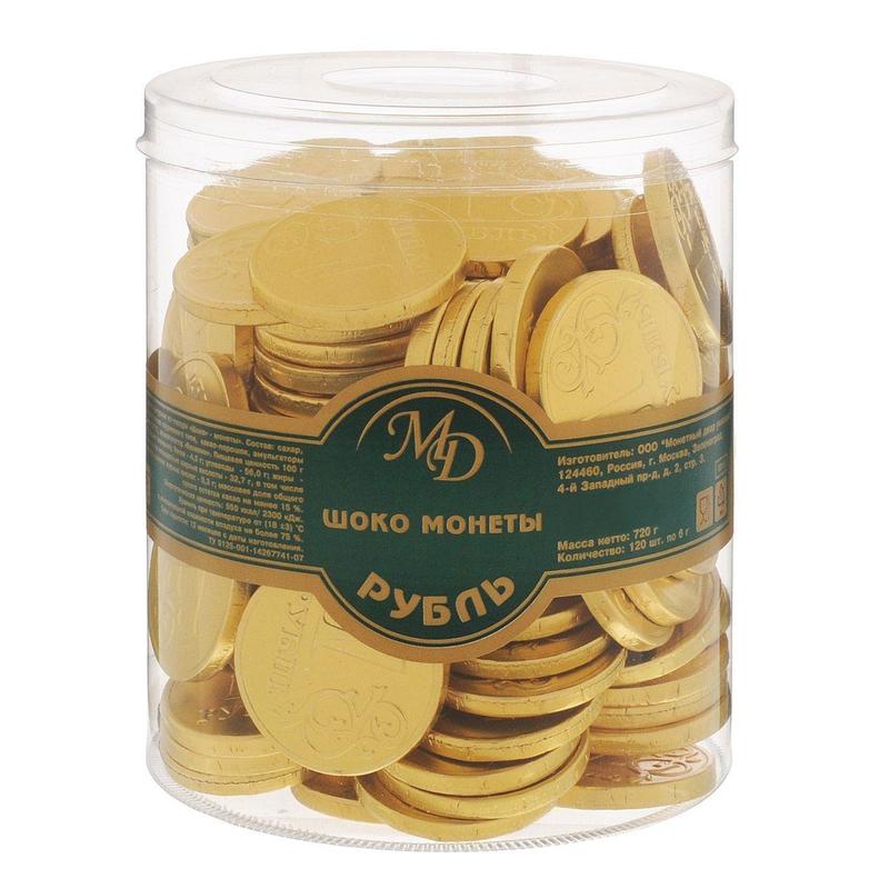 Шоколад порционный Монеты в банке Рубль (120 штук по 6 г)