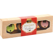 Подарочный набор меда-суфле с разными вкусами будет отличным дополнением к чаепитию. Для получения меда-суфле используются специальные технологии. Мед долго вымешивается при определенной скорости, после чего его выдерживают при температуре 12-14 градусов по Цельсию, тем самым закрепляя его нужную консистенцию. Все полезные свойства меда при этом сохраняются.