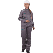 Костюм рабочий летний женский Галактика с СОП бирюзовый/серый (размер 48-50, рост 170-176). Костюм состоит из куртки и полукомбинезона. В костюме используется световозвращающая полоса 50 мм на полочке, спинке, рукавах куртки и по низу полукомбинезона. Контрастные отделочные строчки бирюзового цвета. Куртка: центральная застёжка на молнию и планку с кнопками; спинка с кокеткой; нагрудные накладные карманы с клапаном на ленте-контакт; нижние боковые карманы с наклонным входом; рукава двухшовные с вертикальными шлицами и с манжетами, застёгивающимися на кнопки; вентиляция в области проймы — люверсы; пояс с хлястиками на потайных кнопках для регулирования объёма; воротник-стойка. Полукомбинезон: бретели с эластичной лентой и с застёжкой на фастексы; застёжка-гульф на молнию и застёжка в боковом шве на пуговицы; накладной карман с клапаном на ленте-контакт на нагруднике; боковые карманы с наклонным входом; накладной карман по боковому шву с отделением под инструмент; наколенники с вытачками для свободы движения. Подобрать размер Цвет на изображении товара в интернет-магазине или в печатном каталоге может отличаться от оригинала из-за особенностей цветопередачи монитора.