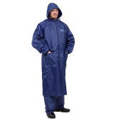 Влагонепроницаемый плащ синего цвета с застежкой на молнии, клапаном против ветра, капюшоном, двумя карманами с клапанами, манжетами на рукавах. Все швы загерметизированы специальной лентой. Непромокаемый плащ изготовлен из прочной плащевой ткани с ПВХ-покрытием. Плотность ткани — 225 г/кв.м. Вес плаща составляет около 1000 г. Водоупорность — не менее 5000 мм водяного столба.