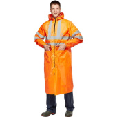 3-х частей и более эргономичен. Застежка на 'витой', более надежной молнии и внутренней ветрозащитной планкой, что гарантирует высокую защиту от влаги. Проклеенные швы 100% защищают от 'протечек'. Манжеты на рукавах — это дополнительная защита от протекания при активном движении. Вентиляционные отверстия в области подмышечных впадин и кокетки комфортно выводят влагу из внутреннего пространства. Наличие шлицы в плаще придает свободу движения. На плащ нанесены светоотражающие полосы шириной 5 см., в соответствии с ГОСТом. Предполагаемая сфера применения: дорожные и коммунальные службы, городское хозяйство, транспорт, работа на открытом воздухе в условиях плохой видимости. Размер 52–54. Рост: 182–188. Стандарт: ТР ТС 019/2011, ГОСТ12.4.28 1–2014. Материал: полиэфир с ПВХ, плотность: 200 г/ кв.м. -
