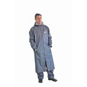 Плащ темно-серого цвета с центральной водостойкой двухходовой застежкой на молнию Dry Zip. Рукава на манжете с эластичной лентой, капюшон с регулировкой объема с помощью кулисы со шнуром и ограничителями, на полочке два врезных кармана с застежкой. Для комфортного теплообмена имеются вентиляционные отверстия под рукавами и на спине. Все швы герметичны. Модель отличается легкостью. Специальная прочная мембранная плащевая ткань Membrane (плотность 185 г/кв.м.) — 100% полиэфир с полиуретановым покрытием; водоупорность более 5000 мм водяного столба, паропроницаемость более 6000 г/кв.м.