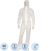 Одноразовый комбинезон изготовлен из дышащего материала полипропилена, обеспечивает хорошую паро-воздухопроницаемость , не образует ворса. Модель из нетканого материала обладает хорошими свойствами, качественная. Центральная молния закрыта планкой, эластичный капюшон с резинкой вокруг лица. Такие же резинки располагаются на талии и внизу брюк. Данная модель не сковывает движения, удобна в носке и безупречно защищает благодаря качественному материалу. Прочная и эластичная ткань устойчивая к механическим воздействиям, плотность ткани составляет 60 г/м . Комбинезон с капюшоном на застежке-молнии . Лицевой вырез капюшона, пояс, низ рукавов и брюк стянуты резинкой. Цвет белый. Соответствует стандартам ТР ТС 019/2011, ГОСТ EN ISO 13982-1-2012 тип 5, EN13034 тип 6-В, ГОСТ Р ЕН 1149-5-2008, ГОСТ ISO 16602-2019. Область применения: малярные работы, очистка производственных помещений и оборудования, утилизация и переноска асбеста, защита от легких брызг невысокой опасности и опасных сухих частиц, монтаж изоляции, дерево и металлообработка, общее промышленное применение. Размер 46–48 (M), рост 167–176 см, обхват груди 92–100 см. Бахилы и перчатки в комплектацию комбинезона не входят.