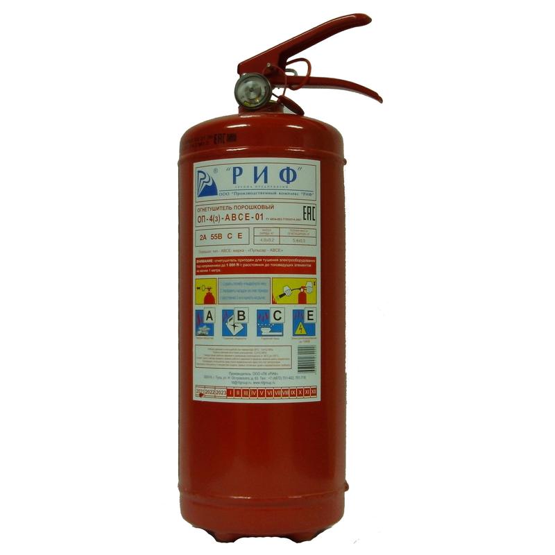 Огнетушитель порошковый ОП-4 (з) АВСЕ РИФ (ЗПУ Латунь) — 4-х килограммовый закачной порошковый огнетушитель. Используется для тушения твердых веществ, жидкостей и газов, а также электроустановок под напряжением. Применяется для устранения очагов возгораний на транспорте, в жилых и общественных помещениях. Температура эксплуатации: от −50 С до +50 С.