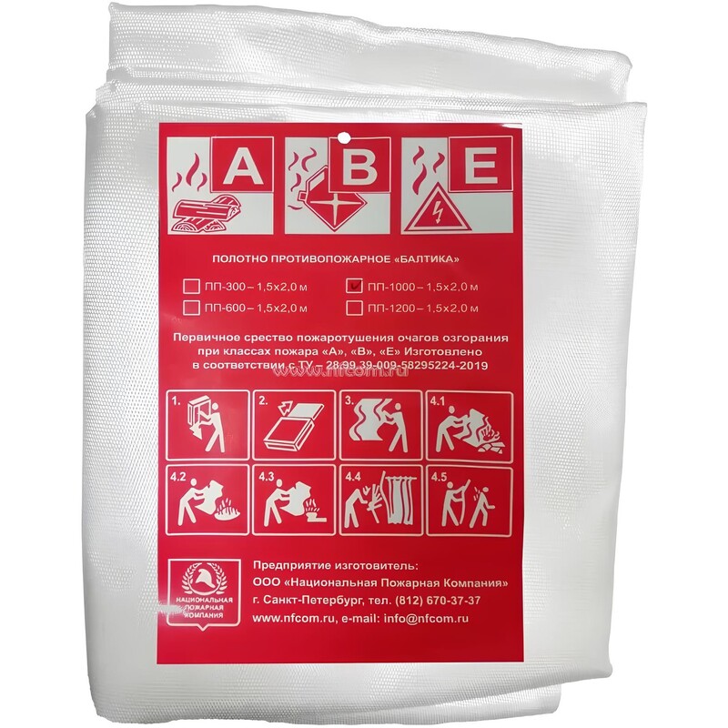 Кошма (полотно) противопожарная «Балтика-01» 1.5×2 метра (ПП-1000). Полотно из стекловолоконной и базальтовой ткани предназначено для защиты от огня и высоких температур. Размер изделия составляет 1500×2000 мм, что позволяет перекрывать большую площадь. В сложенном состоянии размер изделия — 220×30×200 мм, что делает его компактным для хранения и удобным в транспортировке. Цвет полотна — белый.