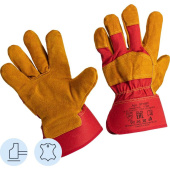 Перчатки спилковые комбинированные. Перчатки комбинированные выполнены из высококачественного спилка КРС и плотной хлопковой ткани. Спилок коровий, мягкий, сорта АВ. Подкладка из флиса на ладонной части и области пальцев. Двойные швы. Обеспечивают высокий уровень комфорта при повышенной стойкости к истиранию, разрыву и проколу. Предназначены для защиты от механических воздействий. Рекомендованы для продолжительного ношения. Материал: спилок КРС толщиной 1.0 мм −1.3 мм, хлопковая ткань 230 г/куб.м. Универсальный размер.
