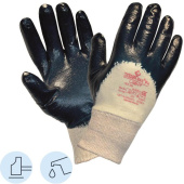 100% хлопковая основа interlock (интерлок) с частичным нитриловым покрытием, манжет — трикотажная резинка. Высокая чувствительность ладони и пальцев, ограниченная стойкость к агрессивным жидкостям, водостойкое покрытие. Высокое сопротивление истиранию, стойкость к разрыву, ограниченная стойкость к проколу и порезу. Рекомендованы для выполнения общих строительных работ, проведения погрузочно-разгрузочных работ.