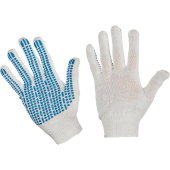 Универсальные рабочие перчатки хб с ПВХ защищают руки от мелких механических повреждений и общих производственных загрязнений во время ремонтных и строительных работ, обеспечивают надежное сцепление с инструментом. Рабочие трикотажные перчатки изготовлены из плотной хлопчатобумажной ткани (70% пряжа, 30% полиэфирная нить), имеют долговечное покрытие из ПВХ синего цвета. Покрытие ПВХ (протектор) помогает обеспечить плотный захват и предотвращает соскальзывание руки. Перчатки оптимальны для складских, погрузочно-разгрузочных, садовых и ремонтных работ. Положите их в автомобиль, и в случае необходимости вы защитите свои руки от травм и грязи. Вес одной пары — 42 г. Класс вязки: 10. Длина перчаток от манжеты до кончика среднего пальца — 22-23 см. Количество пар в упаковке: 10.