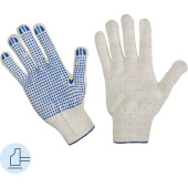 Перчатки рабочие трикотажные с ПВХ Точка 5 нитей 10 класс 52 г (50 пар в упаковке). Универсальные рабочие перчатки хб ПВХ предназначены для защиты рук от мелких механических повреждений и общих производственных загрязнений. Рабочие перчатки изготовлены из хлопчатобумажной пряжи с покрытием точка из поливинилхлорида с нанесением рисунка на внутреннюю сторону перчатки. Покрытие ПВХ помогает обеспечить плотный захват и предотвращают соскальзывание детали. Перчатки трикотажные универсального размера с манжетой на резинке обеспечивают плотное прилегание перчатки к руке. Оптимальны для складских, погрузочно-разгрузочных, садовых и ремонтных работ. Положите их в автомобиль и, в случае необходимости, вы защитите свои руки от травм и грязи. Основа: 70% хлопок, 30% полиэфир; вес пряжи — 133 текс. Материал и рисунок покрытия: ПВХ, точка. Количество пар в упаковке: 50.