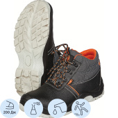 Ботинки Премиум 1301ПК черного цвета на шнуровке выполнены из натуральной кожи. Подошва антистатичная, маслобензостойкая, противоскользящая, двухслойная: полиуретан и термополиуретан. Промежуточный слой из полиуретана обладает амортизирующими свойствами, гасит ударные нагрузки, а также придает обуви легкость, комфортность и повышенные теплозащитные свойства. Ходовой слой изготовлен из износостойкого термопластичного полиуретана ТПУ с улучшенным сопротивлением скольжению, обладающего стойкостью к деформациям и стиранию. Глухой клапан исключает попадание внутрь влаги, пыли и мелких предметов. Объемная колодка специальной конструкции дает возможность работать целый день, не испытывая дискомфорта и усталости. Метод крепления подошвы: литьевой. Подносок: композитный (поликарбонатный), защищает от ударов силой до 200 Дж. Гарантийный срок — 70 дней.