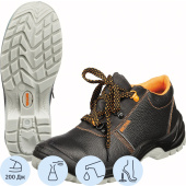 Верх модели из плотной комбинированной кожи. Комбинированная кожа — долговечный материал, обладает воздухопроницаемыми свойствами, не дает ногам потеть. Эргономичная форма подошвы снижает усталость ног, амортизирующие свойства промежуточного полиуретанового слоя подошвы гасят ударные нагрузки, придают обуви легкость и комфортность. Универсальная застежка с помощью шнурков позволяет плотно зафиксировать ботинки на ноге даже с высоким подъемом. Металлический подносок, который защищает носочную часть от ударов силой до 200 Дж — снижает количество травм на производстве.
