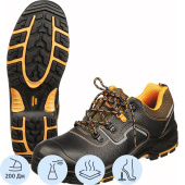 Материал верха из натуральной кожи. Натуральная кожа обладает воздухопроницаемыми свойствами, не дает ногам потеть. Эргономичная форма подошвы снижает усталость ног. Фиксируется обувь на ноге с помощью шнурков, которые плотно обхватывают стопу, улучшая комфорт ношения. В качестве подкладки используется современный подкладочный материал 'Типика' на нетканой основе. Сетчатый материал эффективно отводит влагу от стопы, а также обеспечивает гигиеничность. Композитный (поликарбонатный) подносок, который выдерживает силу удара до 200 Дж, что снижает количество травм на производстве.