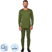 Нательное белье зимнее оливкового цвета. Предназначается для мужчин. Размер: 56-58, рост 194-200. В комплект входит трикотажная фуфайка и кальсоны. Изготовлено из хлопкового трикотажа (футера) с начесом. Хлопковый трикотаж комфортен и гигиеничен, позволяет коже дышать. Фуфайка имеет круглую горловину, манжеты на рукавах. Кальсоны на резинке, нижние края брюк имеют трикотажные манжеты. Белье не сковывает движений. Ткань: 100% хлопок. Плотность: 250 г/кв.м. Рассчитано для использования при температуре до −20 °C. Рекомендации по уходу: максимальная температура стирки — 40°С, обычный режим. Глажение при максимальной температуре прессующей поверхности утюга 110°С. Соответствует ГОСТ 31408-2009. Из-за технологии окрашивания изделий из натуральных материалов возможно расхождение по подтону. Подобрать размер Цвет на изображении товара в интернет-магазине или в печатном каталоге может отличаться от оригинала из-за особенностей цветопередачи монитора.