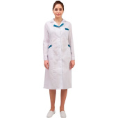 Халат медицинский женский м01-ХЛ белый/бирюзовый (размер 64-66, рост 158-164) Халат м01-ХЛ обеспечивает надёжную защиту от общих производственных загрязнений и сочетает практичность с элегантным дизайном. Изделие рекомендовано для медицинского и административно-хозяйственного персонала. Ткань основная: Ти-Си (65% полиэфир, 35% хлопок), плотность 120 г/кв.м. Материал отличается малой сминаемостью, износостойкостью и комфортностью в носке. Изделия отшиты из белой ткани, но с сиреневым оттенком, который вызывается из-за специфики её отбеливания. Цвет стабилизируется после нескольких стирок. Тип силуэта полуприлегающий. Индивидуальная регулировка ширины по линии талии хлястиком. Эластичные вставки отсутствуют. Манжеты стандартные, без дополнительных элементов. Есть два нижних накладных кармана с фигурной отделкой. Внутренние карманы отсутствуют. Воротник отложной, без застёжки. Застёжка центральная на пуговицы. Рекомендации по уходу: стирка при температуре до 40°C, глажка при средней температуре. Стандарты: ГОСТ 12.4.280-2014, ГОСТ 24760-81, ТР ТС 019/2011. Продукция не является изделием медицинского назначения, производится согласно требованиям ГОСТ 12.4.280-2014. Рекомендуется для работников медицинских, санитарных, лечебно-профилактических и других организаций или учреждений здравоохранения: высший, средний и младший персонал (врачи, медицинские сёстры, акушеры, техники, лаборанты, массажисты, фармацевты, сиделки, санитарки и т.д.), административно-хозяйственной группы (заведующие, кладовщики, кухонный персонал и т.д.). Коллекция медицинской униформы м01 создана для профессионалов здравоохранения. Подобрать размер Цвет на изображении товара в интернет-магазине или в печатном каталоге может отличаться от оригинала из-за особенностей цветопередачи монитора.