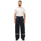 Светоотражающая полоса шириной 5 см размещена внизу брюк. Застежка — гульф на три петли-пуговицы. Брюки прямого силуэта, с отрезным поясом. Пояс завышенный, застегивающийся на две петли-пуговицы, с пятью шлевками. Пояс стеганый на бретелях с регулировкой фастексами. Передняя часть брюк: два накладных кармана с косым входом и объемный карман. Понизу кармана двойная отсрочка. Задняя часть: по линии талии наличие двух выточек. Нижняя часть брюк обработана швом в подгибку. В брюках припуски боковых, шаговых швов направлены на задние половинки, припуск шва сидения направлен на левую заднюю половинку.