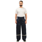 Светоотражающая полоса шириной 5 см размещена внизу брюк. Застежка — гульф на три петли-пуговицы. Брюки прямого силуэта, с отрезным поясом. Пояс завышенный, застегивающийся на две петли-пуговицы, с пятью шлевками. Пояс стеганый на бретелях с регулировкой фастексами. Передняя часть брюк: два накладных кармана с косым входом. По низу кармана двойная отсрочка. Задняя часть: по линии талии наличие двух выточек. Нижняя часть брюк обработана швом в подгибку. В брюках припуски боковых, шаговых швов направлены на задние половинки, припуск шва сидения направлен на левую заднюю половинку. Брюки предназначены для защиты работающих от пониженных температур в различных отраслях промышленности, а также производственных загрязнений. Рекомендуется для использования в ЖКХ, озеленении территории, строительстве, проведении ремонтных работ, промышленности, логистике, сельском хозяйстве. Соответствуют стандартам ГОСТ 12.4.303-2016, ТР ТС 019/2011.