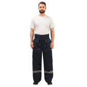 Светоотражающая полоса шириной 5 см размещена внизу брюк. Застежка — гульф на три петли-пуговицы. Брюки прямого силуэта, с отрезным поясом. Пояс завышенный, застегивающийся на две петли-пуговицы, с пятью шлевками. Пояс стеганый на бретелях с регулировкой фастексами. Передняя часть брюк: два накладных кармана с косым входом. По низу кармана двойная отсрочка. Задняя часть: по линии талии наличие двух выточек. Нижняя часть брюк обработана швом в подгибку. В брюках припуски боковых, шаговых швов направлены на задние половинки, припуск шва сидения направлен на левую заднюю половинку. Брюки предназначены для защиты работающих от пониженных температур в различных отраслях промышленности, а также производственных загрязнений. Рекомендуется для использования в ЖКХ, озеленении территории, строительстве, проведении ремонтных работ, промышленности, логистике, сельском хозяйстве. Соответствуют стандартам ГОСТ 12.4.303-2016, ТР ТС 019/2011.