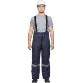 Светоотражающая полоса размещена внизу брюк. Брюки прямого силуэта, с отрезным поясом. Пояс завышенный, застегивающийся на две петли-пуговицы, с пятью шлевками. Пояс стеганый на бретелях с регулировкой фастексами. Передняя часть брюк: два накладных кармана с косым входом и наколенниками. К поясу брюк сзади пристегивается на молнию спинка, подкладка спинки — флис. Понизу кармана двойная отсрочка. Задняя часть: по линии талии наличие двух выточек. Нижняя часть брюк обработана швом в подгибку. В брюках припуски боковых, шаговых швов направлены на задние половинки, припуск шва сидения направлен на левую заднюю половинку. Брюки предназначены для защиты работающих от пониженных температур в различных отраслях промышленности, а также производственных загрязнений. Рекомендуются для использования в логистике, легкой промышленности, строительстве. Изготавливаются в соответствии с ГОСТ 12.4.303-2016, ТР ТС 019/2011.