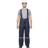 Светоотражающая полоса размещена внизу брюк. Брюки прямого силуэта, с отрезным поясом. Пояс завышенный, застегивающийся на две петли-пуговицы, с пятью шлевками. Пояс стеганый на бретелях с регулировкой фастексами. Передняя часть брюк: два накладных кармана с косым входом и наколенниками. К поясу брюк сзади пристегивается на молнию спинка, подкладка спинки — флис. Понизу кармана двойная отсрочка. Задняя часть: по линии талии наличие двух выточек. Нижняя часть брюк обработана швом в подгибку. В брюках припуски боковых, шаговых швов направлены на задние половинки, припуск шва сидения направлен на левую заднюю половинку. Брюки предназначены для защиты работающих от пониженных температур в различных отраслях промышленности, а также производственных загрязнений. Рекомендуются для использования в логистике, легкой промышленности, строительстве. Изготавливаются в соответствии с ГОСТ 12.4.303-2016, ТР ТС 019/2011.