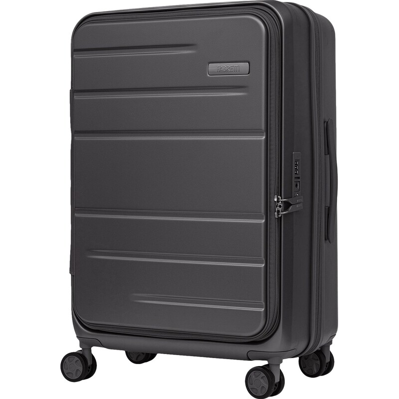 Чемодан Fabretti размер M 67 л из поликарбоната серый Чемодан используется для перевозки багажа и рассчитан на среднюю продолжительность поездок. Модель разработана для лёгкой и удобной вертикальной загрузки вещей. Корпус выполнен из литого поликарбоната, устойчивого к ударам, износу и перепадам температур. Ребристая поверхность выполнена в однотонном сером цвете. Внутри расположено одно основное отделение с эластичными фиксаторами и съёмной крышкой. Предусмотрен сетчатый карман на молнии. При увеличении отделения глубина достигает 33 см. Чемодан закрывается на молнию и оснащён замком TSA. Телескопическая ручка из авиационного алюминия фиксируется в трёх положениях. Верхняя и боковая ручки встроены в корпус, боковые ножки обеспечивают устойчивость при горизонтальной установке. Двойные каучуковые колёса вращаются на 360 градусов и обеспечивают плавное движение. Габаритные размеры — 45×28×67 см. Вес — 3.8 кг. Объём — 67 л. Размер — M.