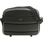 Бьюти-кейс Fabretti из полипропилена чёрный Бьюти-кейс Fabretti в чёрном цвете выполнен из полипропилена — современного материала, для которого характерны высокая ударопрочность, стойкость к перепадам температур, отличная износостойкость. Закрывается на полукруглую молнию с двумя бегунками и имеет «ушки» для навесного замка (замок в комплект не входит). Внутри 3 боковых кармана для мелочей: 2 открытые с фиксирующими резинками и один на молнии. Внутренние текстильные ограничители на липучках. На тыльной стороне предусмотрена резинка, позволяющая крепить аксессуар на ручку чемодана. Сверху есть ручка для удобства переноски. В комплекте предусмотрен съёмный плечевой ремень с резиновой плечевой накладкой (ширина — 3,5 см, длина — 120 см).