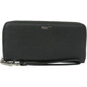 Кошелек женский Fabretti из натуральной кожи черного цвета (Q7006N-2). Вместительный женский кошелек Fabretti в черном цвете выполнен из натуральной кожи гладкой фактуры. Основное отделение закрывается на полукруглую молнию. Внутри 4 отделения на полную купюру, карман на молнии — для мелочи, 1 слот с прозрачной пленкой для проездного или пропуска, 2 открытых боковых кармана и 8 слотов для банковских карт. На тыльной стороне расположен карман быстрого доступа на молнии. Практичный аксессуар дополнен удобным съемным ремешком и при необходимости может выполнить функцию клатча, поскольку с легкостью вместит паспорт, смартфон и другие мелочи. Цвет фурнитуры — черненый никель.