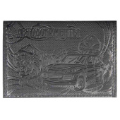 Обложка для бумажника водителя горизонтальная выполнена из натуральной кожи в классическом черном цвете методом художественного тиснения. На лицевой стороне обложки нанесен орнамент. Вверху расположена надпись Автодокументы, ниже объемное изображение современного автомобиля рядом с очертанием тигра. На обороте обложки в небольшой рамке из орнамента расположена надпись мелким шрифтом изделие из натуральной кожи.