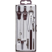 Набор чертежных принадлежностей из 7-и предметов: циркуль из металлического сплава (длина 140 мм), запасной грифель, крон-циркуль, насадка с универсальным держателем, металлическая ручка, измеритель, игольная вставка.