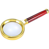 Лупа классическая в золотой оправе имеет диаметр 70 мм. Основа выполнена из пластика с покрытием золотого цвета. Форма основы — окружность вокруг стекла и длинная ручка-держатель. Оправа линзы выступает за края, предупреждая механические повреждения при движении лупы по поверхности.