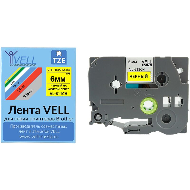 Ламинированная лента VL-611CH с чипом изготовлена специально для маркировки прямых поверхностей. Ленты шириной 6 мм и длиной 8 метров прекрасно держатся на разных ровных, окрашенных, шероховатых или очень грубых поверхностях за счет уникального клеящегося слоя. Подходит для маркировки проводов, щитков, печати ценников и пр. Лента устойчива ультрафиолету и попаданию влаги. Лента Vell имеет желтый цвет подложки и черный цвет текста, сделаны из высококачественного материала — полиэтилентерефталат. Выдерживают диапазон температур от -40°C до 80°C.