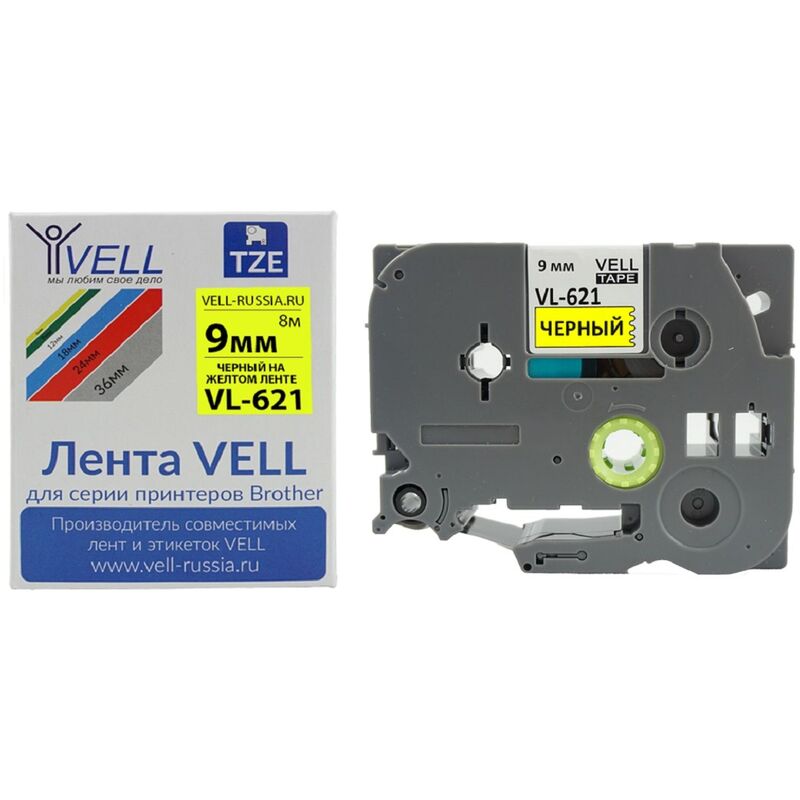 Лента Vell VL-621 разработана для принтеров Brother. Длина 8 метров, ширина 9 мм, черный текст на желтом фоне. Подходит для принтеров: PT 1010/ 1280/ D200/ D210/ H105/ H110/ E100/ E110/ D450/ E300/ D600/ 2700/ P700/ E550/ 9700/ P900.