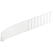 Пластиковый полочный разделитель высотой 60 мм, максимальная длина 385 мм, может обламываться через каждые 25 мм до длины 185 мм. Применяется для организации на полке товаров среднего размера. Подходит для организации на полке косметических товаров, сигарет, продуктов питания. Материал: прозрачный ударопрочный пластик.