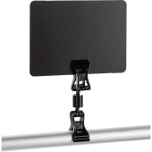 Универсальный ценникодержатель, состоящий из 2-х прищепок, одна из которых крепится на торец полки, край коробки, корзины, блюда толщиной до 10 мм, а другая непосредственно держит ценник.