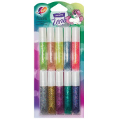 Гель с блестками для детского творчества используют для придания необычных переливающихся эффектов, как украшение рисунков, открыток, поделок из глины, гипса, воска, соленого теста, фольги, стекла и т.п. Легко наносится на любую поверхность, при высыхании становится прозрачным, оставляя на поделке переливающиеся блестки. Время высыхания геля зависит от толщины слоя. Не имеет запаха. Безопасен для детей.